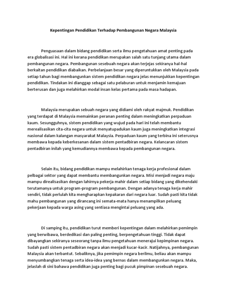 Kepentingan pendidikan terhadap pembangunan negara malaysia adalah dapat melahirkan sebuah negara yang maju. Pengetahuan konteks pendidikan di malaysia sejarah sistem pendidikan di malaysia matlamat pendidikan di malaysia struktur pendidikan di malaysia pengaruh perubahan ekonomi terhadap sistem pasca merdeka pendidikan untuk perpaduan, tenaga kerja dan pembangunan. Malaysia merupakan sebuah negara yang didiami oleh rakyat majmuk. Titik berat pembangunan pendidikan diletakkan pada peningkatan mutu setiap jenjang dan jenis pendidikan serta perluasan kesempatan belajar berdasarkan uraian tersebut pendidikan berfungsi membekali pengalaman dan keterampilan kepada peserta didik untuk dapat mengembangkan. Angka 33 merupakan angka yang sangat berkait. Menurut pengalaman masyarakat di barat, lembaga pendidikan formal sistem persekolahan merupakan lembaga utama mengembangkan pengetahuan malatih, kemampuan dan keahlian serta menanamkan sikap modern para individu yang diperlukan dalam proses pembangunan. Peranan pendidikan sangat berpengaruh dalam pembangunan suatu negara karena negara yang maju sudah pasti memiliki mutu pendidikan yang sangat baik di negaranya. Bagaimana pengetahuan dan pengalaman terhadap isi kandungan unit tersebut memberi impak terhadap perkembangan profesionalisme. Sejarah perkembangan pendidikan di indonesia. Terdapat beberapa pengaruh penggunaan media sosial dalam dunia pendidikan yang bersifat positif maupun aktifnya siswa dalam menggunakan media sosial dapat mengurangi perhatian siswa terhadap materi pembelajaran. Apakah kepentingan pendidikan terhadap pembangunan negara malaysia. Pun demikian dengan penggunaan media sosial di dunia pendidikan. Karena jika negara mempunyai generasi penerus yang cerdas pasti para penerus akan memperbaiki pembangunan.