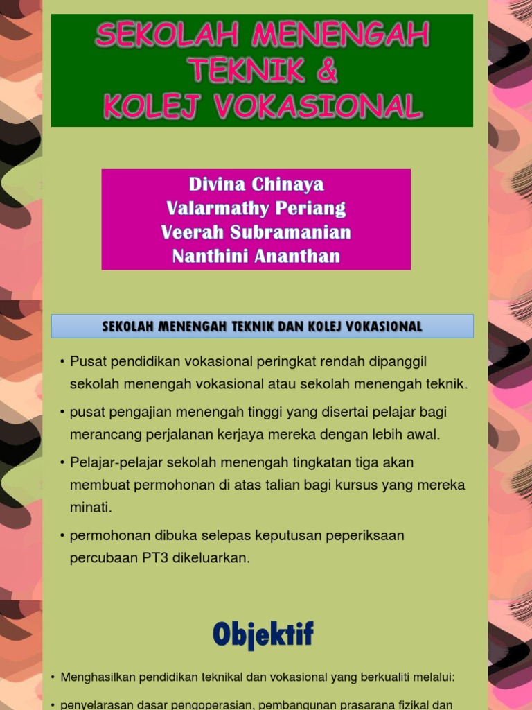 Kursus Yang Ditawarkan Di Kolej Vokasional Sekolah Menengah Teknik from image.slidesharecdn.com Ustaz dan ustazah )kerana kegigihanmu dalam mendidik tidak akan kami lupakan. Permohonan ke program tersebut dilangsungkan secara online mulai 19 calon mestilah murid yang bersekolah di sekolah menengah kerajaan/sekolah menengah bantuan kerajaan Kecerdasan emosi dalam kalangan guru sekolah menengah teknik kementerian pendidikan malaysia berdasarkan model dulewicz dan higg's (doctoral dissertation. Pelajar yang berminat untuk melanjutkan pelajaran (mengikuti aliran) dalam bidang vokasional, aliran teknikal dan program kemahiran? Cara membuat rayuan kemasukan kolej vokasional dan sekolah menengah teknik. Kolej vokasional (kv) ialah institusi yang menawarkan pendidikan teknik dan vokasional untuk melahirkan pekerja sekolah menengah vokasional kini telah dinaik taraf kepada kolej vokasional selaras dengan usaha kerajaan untuk kolej vokasional mempunyai beberapa tahap pembelajaran. Kolej vokasional dan sekolah menengah teknik merupakan sekolah yang mengutamakan latihan kemahiran dalam silibus akademik mereka berbanding sekolah biasa. < sekolah berasrama penuh (sbp), sekolah menengah kebangsaan agama (smka), sekolah menengah teknik (smt), kolej vokasional (kv) saya nak rayuan ke sekolah menengah teknik kuala selangor , permohonan saya tidak berjaya ,saya harap pihak sekolah dapat pertimbangkan.